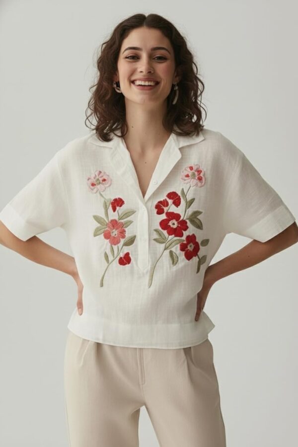 Step into effortless sophistication with this beautifully crafted women’s embroidered cotton top. Designed for modern women who value comfort without compromising on style, this top blends breathable fabric with delicate floral detailing for a refined everyday look.Featuring intricate red and pink floral thread embroidery on the front, this top adds a graceful charm that enhances your outfit without being overpowering. The embroidery brings a handcrafted appeal, making it ideal for both casual and semi-formal settings.