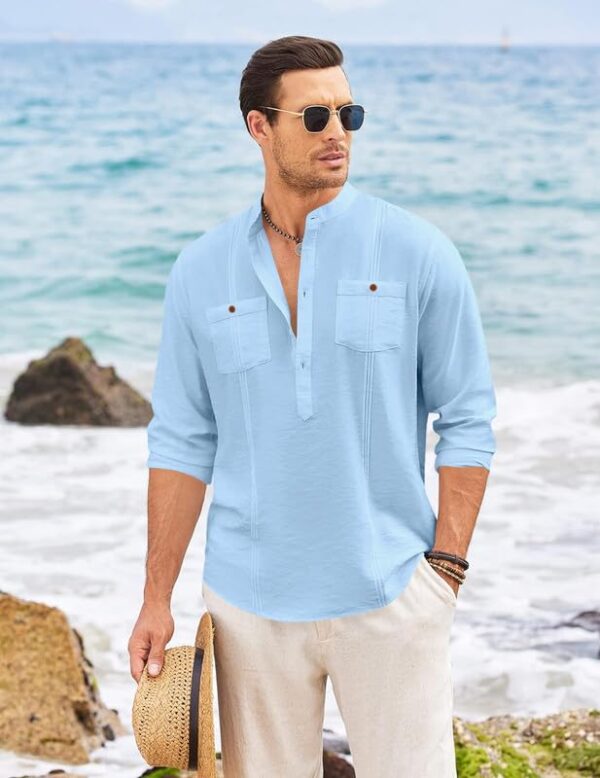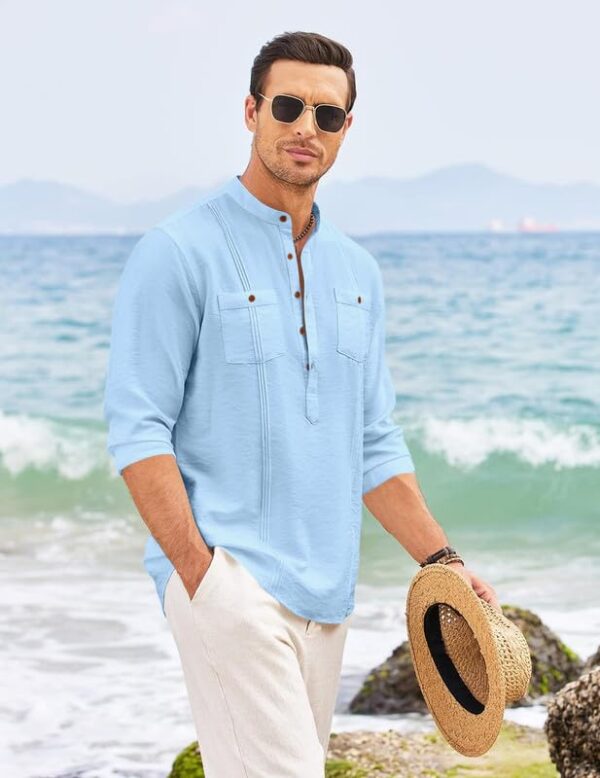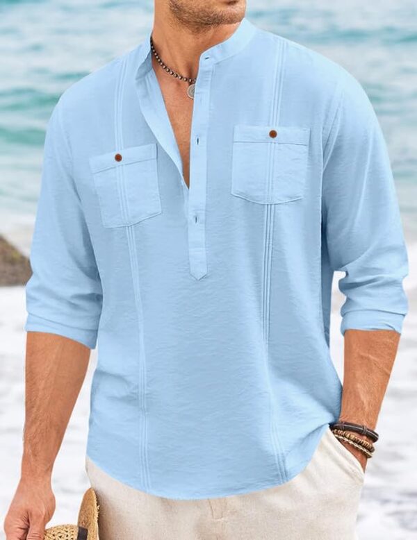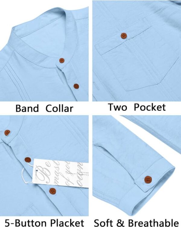 - 【STYLISH DESIGN】Men’s Short Kurta, with band collar, two rows of pleats down each side of the front chest, two pockets, real buttons, solid color, long sleeve(can roll-up), 5-button placket closure and arc hem.