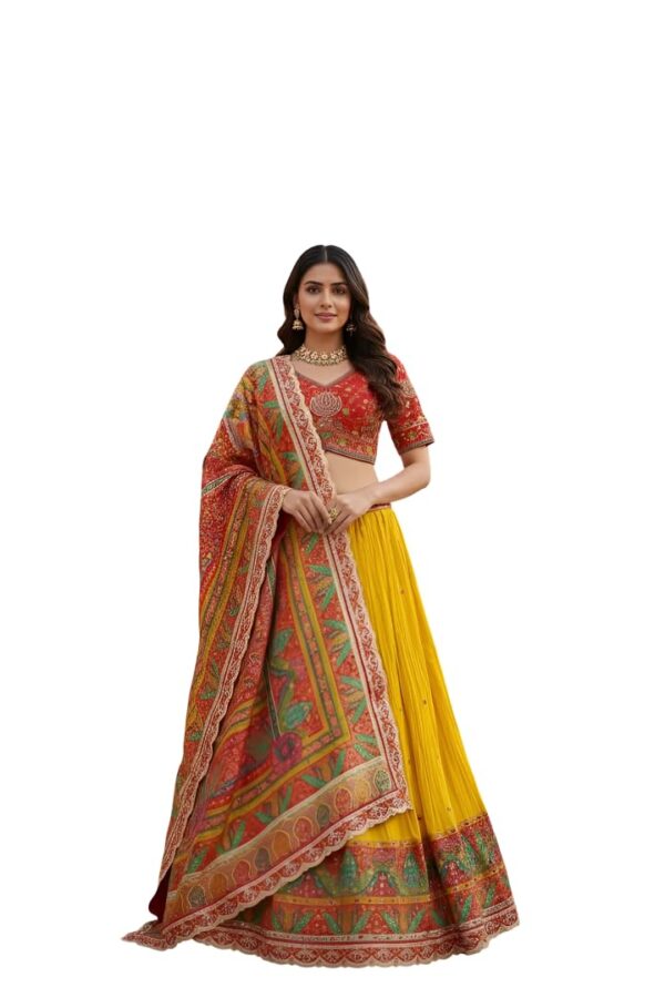 - VIBRANT COLOUR COMBINATION: Striking yellow base lehenga paired with a red embroidered choli creates a bold, eye-catching contrast perfect for special celebrations