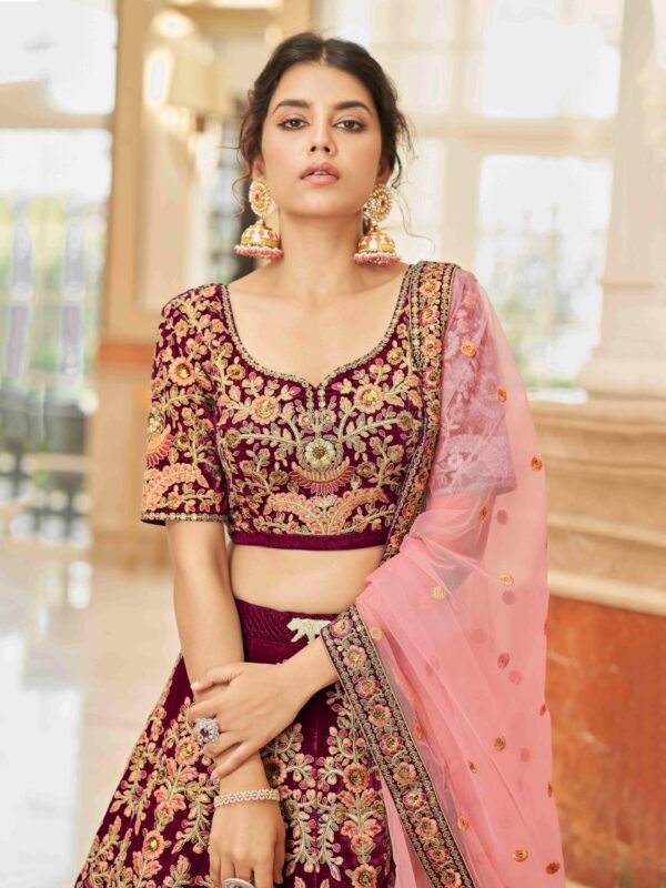Women’s beauty is magnified tenfold in this maroon color lehenga originated with velvet material accomplished with thread embroidery, sequins work, zari work, and dori work.